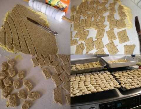 Con un cuchillo, cortar galletas (primera y segunda foto, fila superior). Porque las galletas tienen bordes afilados y las esquinas puntiagudas, aplasta las esquinas y suavizar los bordes para cuando se cuecen al horno, no causa daño a los perros cuando les engullir (tercera foto, abajo a la izquierda).