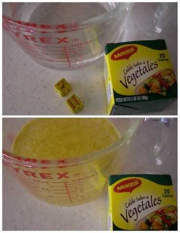A 2 tazas de agua tibia, agregue 2 cubitos de verduras y mezcle bien.