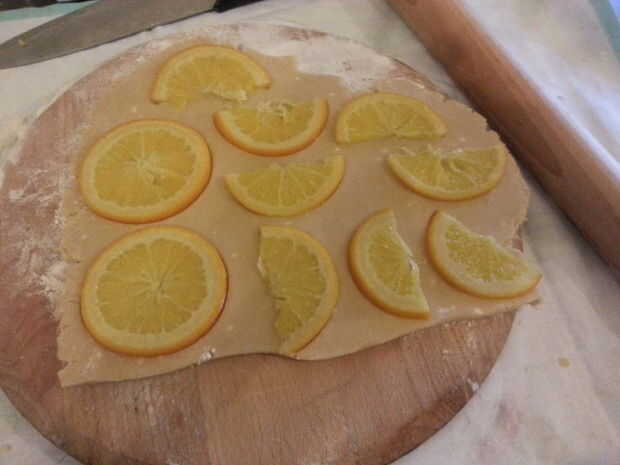 Subir el horno a 180 grados celsius de calor. Volver a la masa y estirar sobre una superficie limpia. Me gusta poner mi tabla en un húmedo n detenerlo estable. Usando harina para quitar el polvo según sea necesario, la masa del rodillo a unos 1/4 pulgada de espesor, las cookies se elevarán un poco a cerca de 1/2 pulgada en el horno. Cuando se enrolla la masa Coloque sus rodajas de naranja sobre la masa enrollada. Ellos tienes todo para galletas grandes o a la mitad de tamaño más adecuado del agua, lo que le apetece, hice una mezcla de ambos. Cuando se colocan las rodajas sobre la masa poner un trozo de film transparente sobre la parte superior y darles uno o dos rodillos con su rodillo para embeber las rodajas un poco en la cookie. Trate de presionar muy ligeramente para no ir todo el camino a través de la masa.
