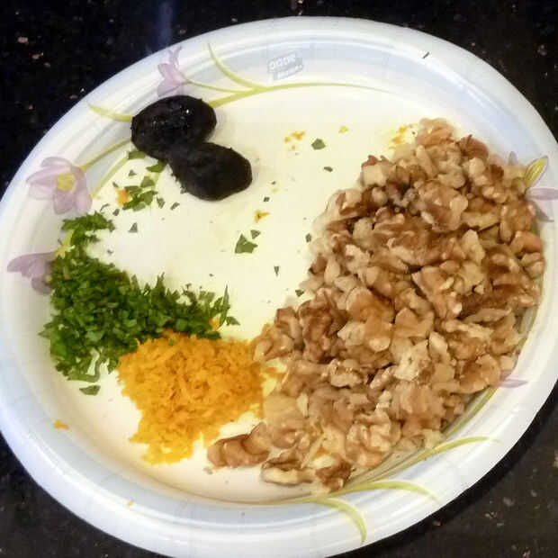 El ajo negro es ajo que se fermentó durante 40 días. Aprende a hacer tu propio aquí! Este proceso le da el ajo un sabor picante, pasas que marida perfectamente con orange. Para acompañar estos sabores, añadí nueces y menta fresca. Mirando la lista de ingredientes, no puede ser galletas de pensamiento - pero después de que usted pruebe esta receta, nunca pensarás lo mismo otra vez.