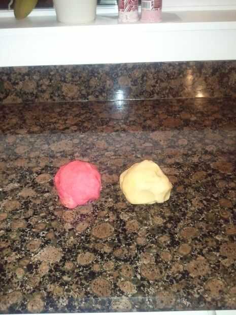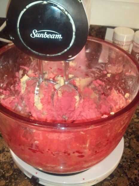 A continuación tendrá que dividir su masa para galletas por la mitad.  Agregar el colorante rojo a uno de los cuencos de pasta de la galleta y mezclar bien.