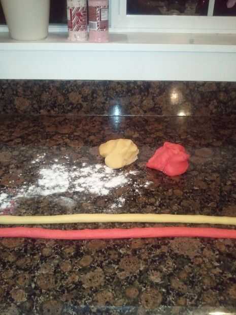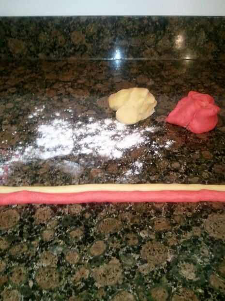 Después de una hora sacar la masa de la nevera.  La masa debe ser lo suficientemente firme como para rodar en densamente espagueti como tiras.  Tienes que estas sobre una 1/2 pulgada de grueso.  Rodillo tanto una tira roja y una blanca y lugar de lado a lado.