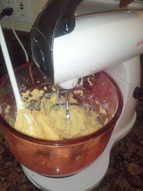 A continuación quiere crema de mantequilla, huevos y el azúcar juntos, mezclar bien.  Agregar los extractos, mezclar y luego añadir la harina y la sal, mezclar bien.
