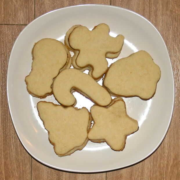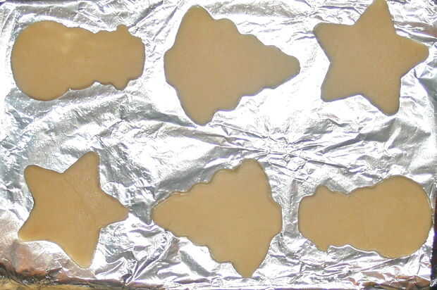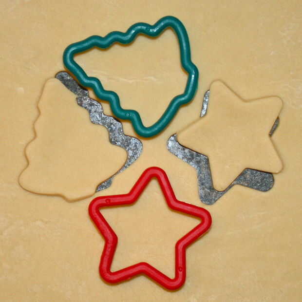Estirar la masa de galletas y uso abundante de harina para evitar que se pegue a las manos, el pin y el contador. Cortar formas, volver a rodar los restos, corte más formas y colocarlos en placas para galletas ligeramente engrasada o forrada.