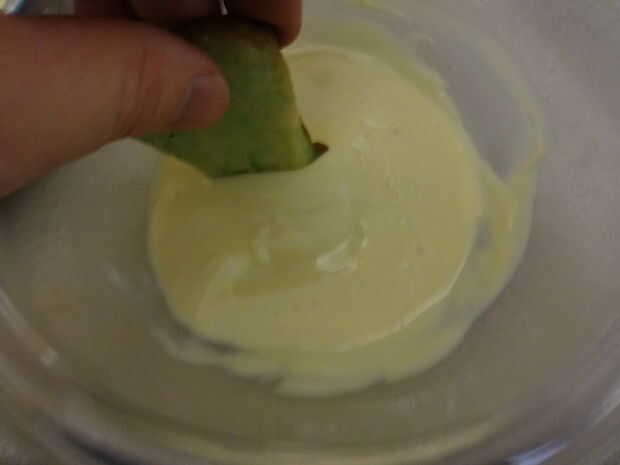 Sumerja la parte superior de cada galleta en la mezcla de chocolate blanco, permitiendo que el exceso gotee apagado.