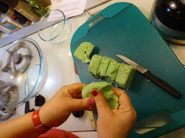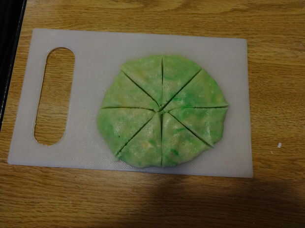 Presiona cada pieza en redondo de 6 pulgadas. Cortar cada una de las 6 Piezas embutidas en 8 cuñas. (Pizza empanada estilo)