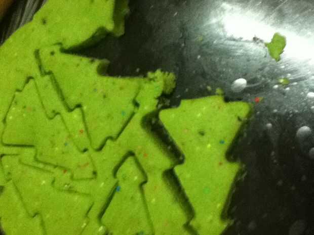 Estirar la masa a 2cm de grosor. Empiece a cortar la masa en lindos árboles de Navidad verde.