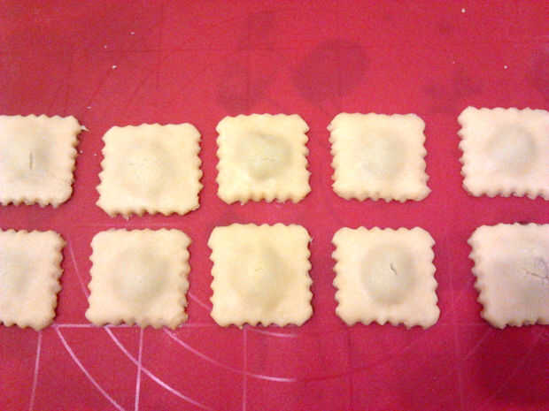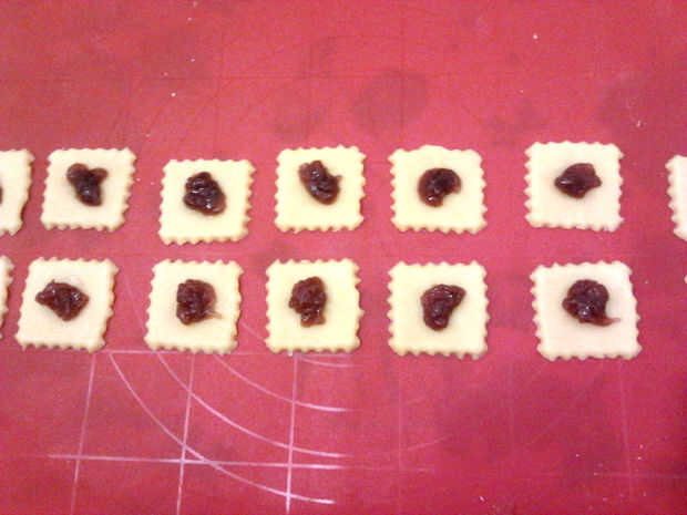 Llevar a un grupo de cuadrados y poner algún atasco en él. Media cucharadita en cada cookie fue más que suficiente para mí. Ahora toma el otro grupo de cuadrados y ponerlos en los con la mermelada de cerrarlas. Puede añadir algo de agua en los lados para ayudar a cerrarlos y empuje un poco.
