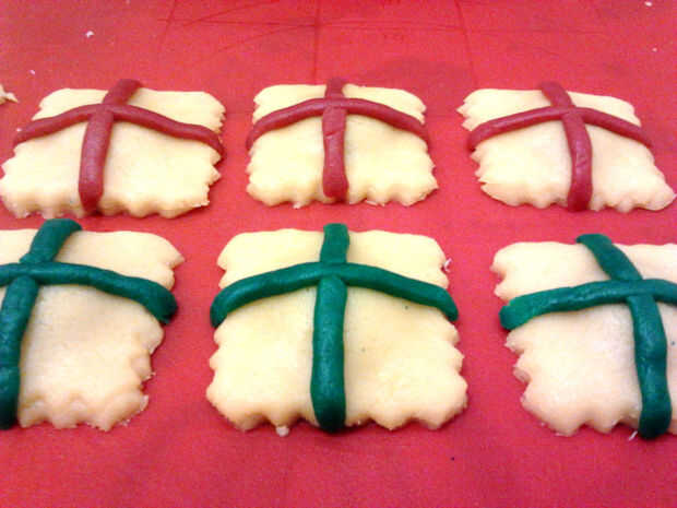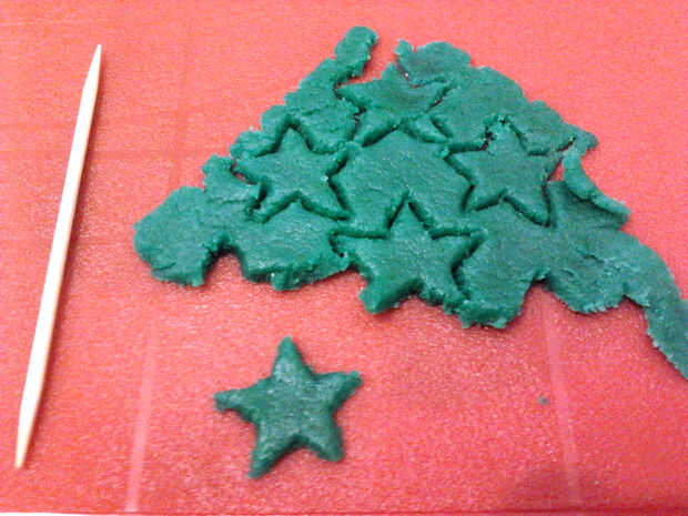 Una vez que la masa coloreada, tomar pequeños trozos de ella y hacer pequeñas tiras para poner en las galletas, como cordones presente. También cortar estrellas pequeñas con un palillo para colocar en el centro de las galletas, donde se unen las tiras.