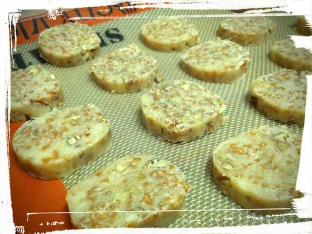 Retire, corte en redondos de 1/4 de pulgada y coloque en una bandeja de galletas engrasado o bandeja de mat-cubierta de silicona. Hornee a 350 grados hasta que estén dorados en la parte inferior, 10-15 minutos. Usted notará los pedacitos de caramelo se burbuja, así que mantener un ojo sobre ellos para que no se quemen.