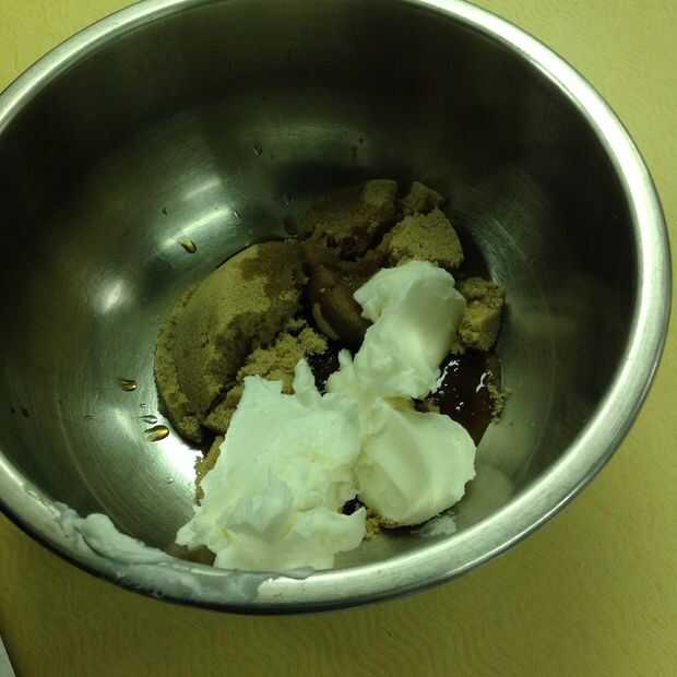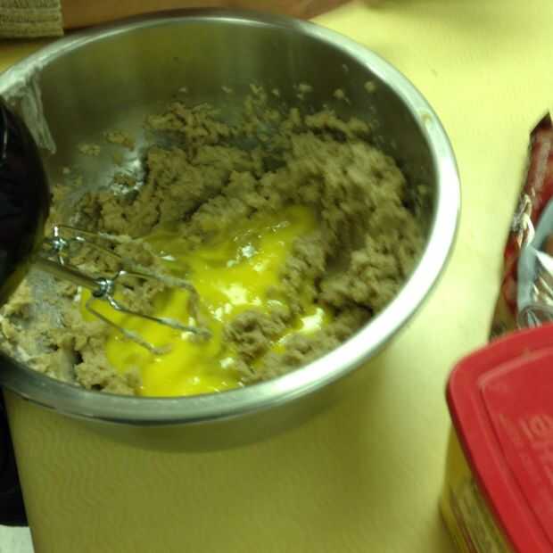 Mezcla de manteca, agua, panela, vainilla y batir junto en un medio de tamaño de recipiente. Una vez vencer juntos, a poner huevos en y batir lentamente. Bate hasta que todo está completamente mezclado.