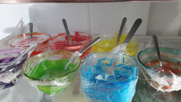 Dividir el glaseado en pequeños cuencos (tantos colores como quieras) y usar colores de jel para el glaseado de color. Utilice la punta de un palillo de dientes al agregar color y añadir más si lo desea.