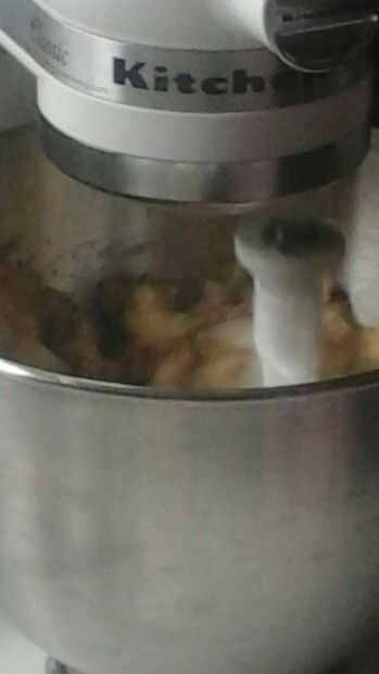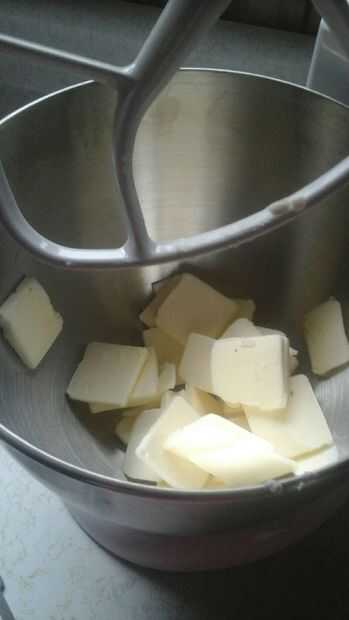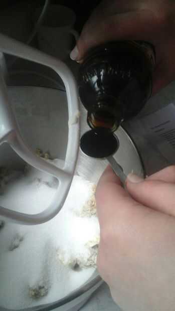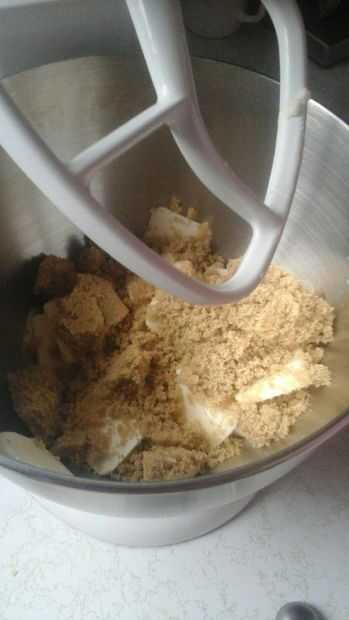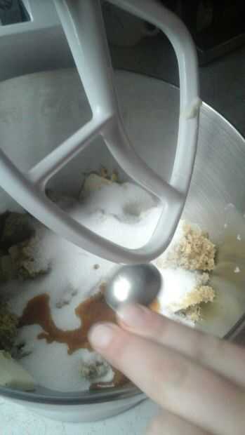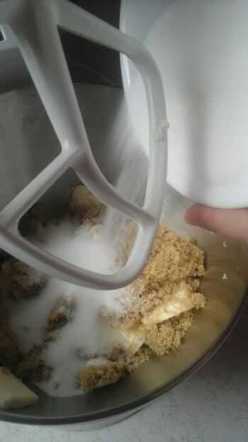 Batir juntos la mantequilla (yo no tengo microondas y no quería esperar a suavizar lo cortado para arriba y batirlo en la Kitchen-Aid) granulado de azúcar, azúcar moreno y extracto de vainilla.