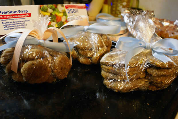 Partí a las galletas en pilas de tres para las tres personas que le estoy dando, corte un pedazo de envoltura de plástico lo suficientemente grande como para envolver alrededor de la pila y atado cintas alrededor de la parte superior.