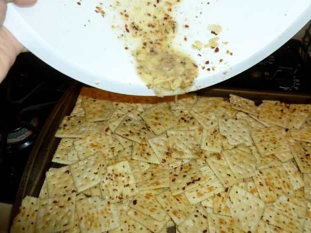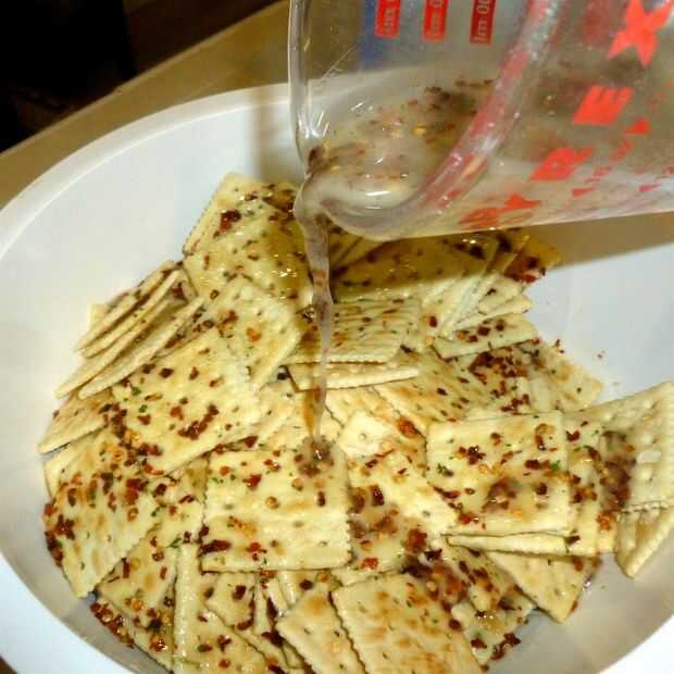 - Coloque todas las cuatro mangas de galletas en el bol grande y Vierta lentamente la mezcla de aceite sobre las galletas.