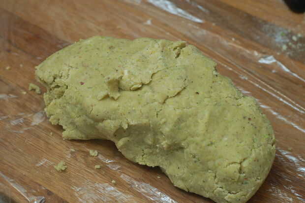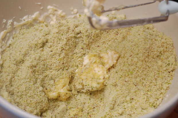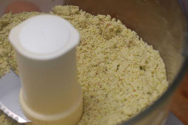 1. Poner los pistachos y azúcar en el procesador de alimentos y pulso hasta finamente molido y que se asemeja a pan rallado fino.