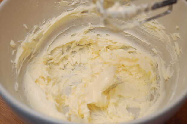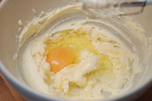 2. En un bol batir la mantequilla con una batidora eléctrica hasta que estén suaves y luego añadir el huevo y batir durante 30 segundos más o menos.
