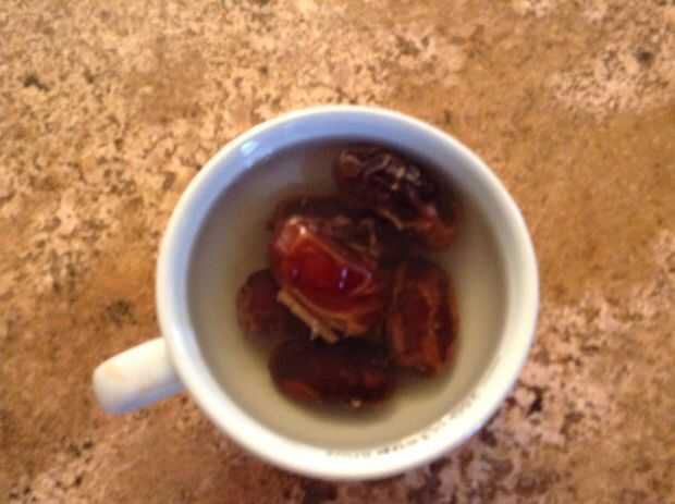 Suavizar las fechas en una taza o tazón de agua tibia. (Mientras haces estos pasos Precaliente su horno a 350 grados fahrenheit).