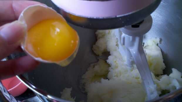 Para separar un huevo, usando un recipiente limpio, romper el huevo y luego Vierta la yema de huevo y hacia atrás entre las dos mitades de la cáscara de huevo hasta que todo el blanco queda en el recipiente.  Guardar para huevos revueltos o hacer macarons.  No necesita el huevo para el resto de esta receta.  Volcar las yemas de 2 huevo en el mezclador y funcionar la batidora hasta que esté incorporado.