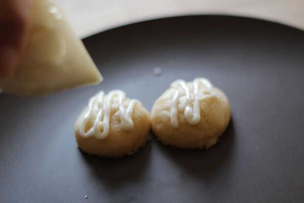 Cuchara glaseado en una bolsa de sándwich de plástico ziplock, cortar el la punta.  Utilice la bolsa de plástico para tuberías de helar en las cookies mientras todavía caliente (dejar cookies sentarse unos 10 minutos después de ser retirado del horno en la olla que se enfrié, luego mueven la placa en que desea helada).
