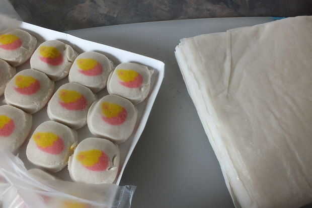 1 paquete de masa para galletas preparadas; mina es diseños de Pascua rosa y amarillo, es por eso que se parece a las patas de cangrejo