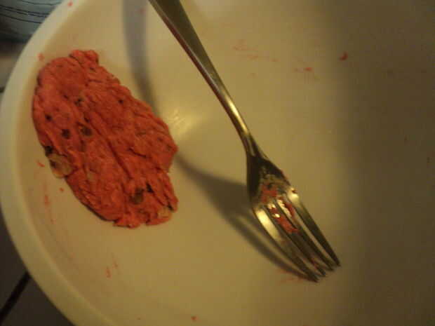 En un recipiente aparte, poner una cucharada más o menos de agua fría. Utilice algunos buena rojo tinte #2, o cualquier número rojo colorante de alimento que tiene alrededor. Dato curioso: aunque este producto no es Kosher de ninguna manera porque usa tocino de cerdo real, tintes rojos también están prohibidos puesto que pueden derivarse de los insectos. Usted necesita solamente una gota o dos. Mezclar hasta llegar a una solución de rojo. Tomar de 1/3 de la mezcla de grasa y la harina e incorporar que en el rojo de color agua. Mezclar hasta que todos juntos en una bola. Usted puede agregar otra cucharada de harina o para empapar encima de exceso de líquido si la mezcla está demasiado húmeda.