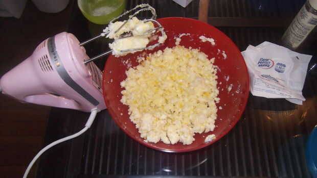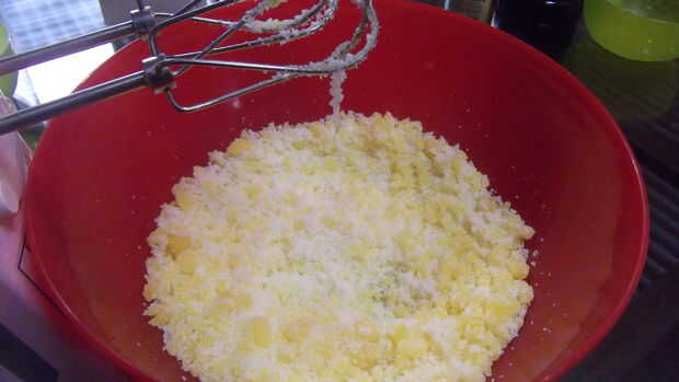 3. Añadir la mantequilla ablandada (no derretida! Por el amor de rompope, no derretirla!) a la mezcla de huevo/azúcar. Ahora se verá como muy mullida revuelto.