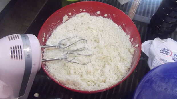 5. mezclar los huevos revueltos con el (ojala ahora amorosa) mezcla de la harina. ESTO SE VERÁ RARO Y POLVORIENTO, ASÍ. Aspirar. (no literalmente).