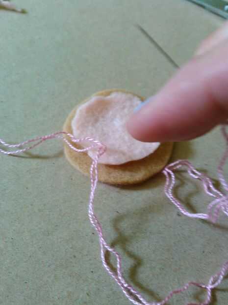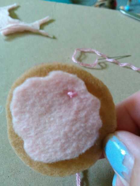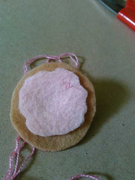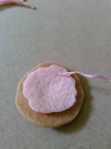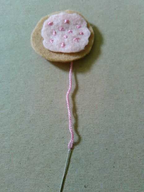 Puesto que los granas están cubriendo la guinda, esto es suficiente para asegurar el color para el marrón. Utilice el hilo para coser poco cruces al azar en el fieltro de colores. Me gusta el poco granas pero les pueden coser más.