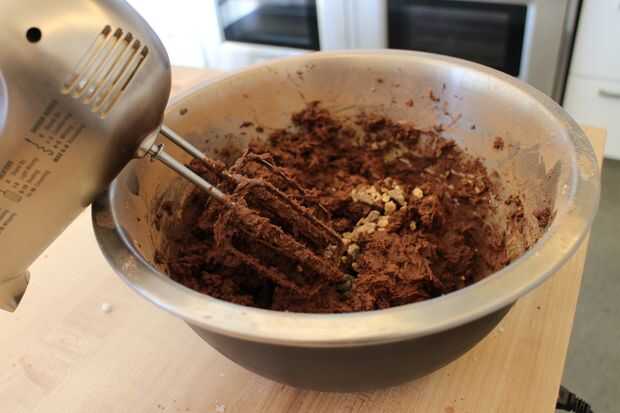 Combinar la mezcla de ingredientes secos con los ingredientes húmedos. Luego se mezclan en los chips de chocolate y el caramelo cubiertos de chocolate.