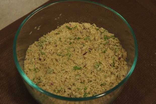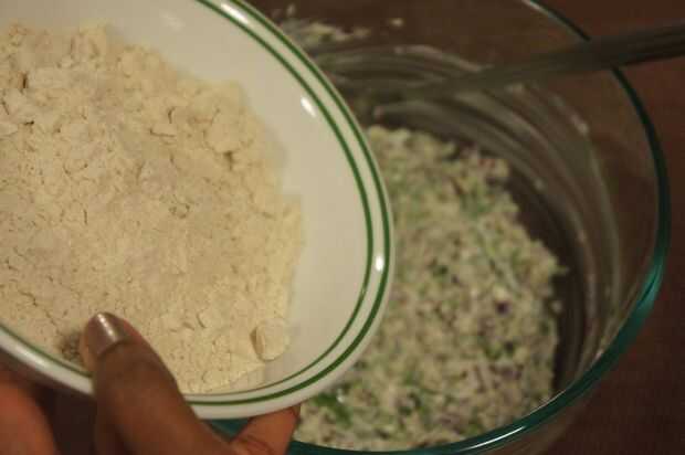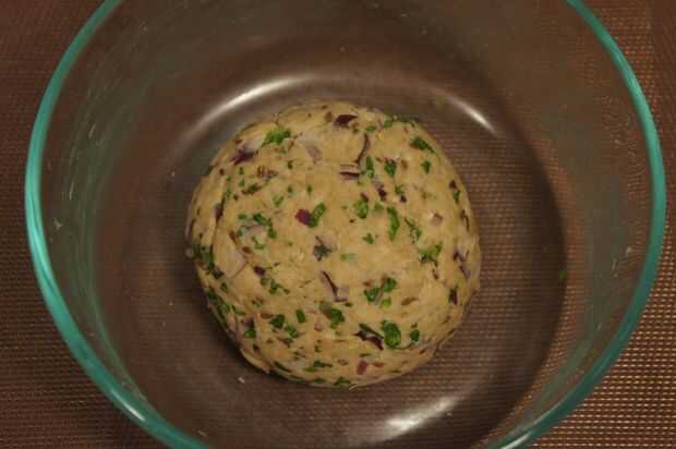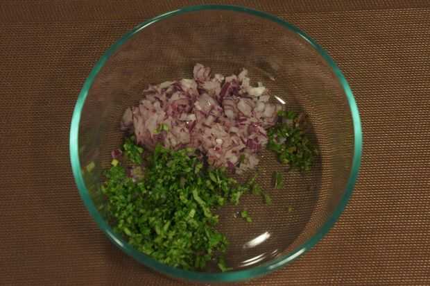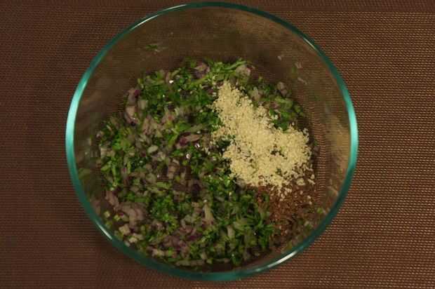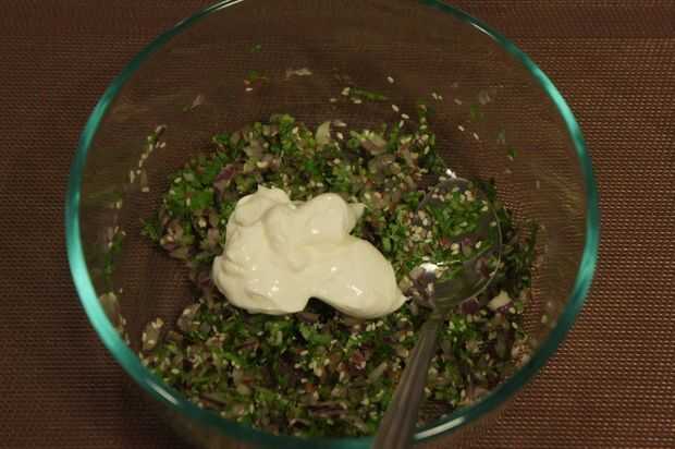 1) en un bol, añadir la cebolla picada, cilantro, Chile verde, semillas de sésamo, semillas de lino, crema agria y mezcle bien.