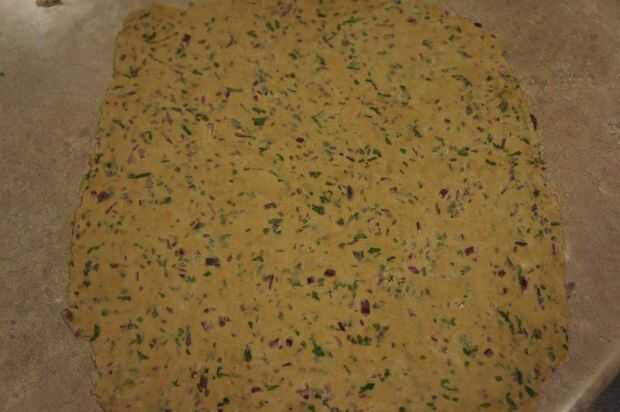 1) tomar la masa y rodillo plana lo que es tan delgado como sea posible (1/4 pulgada de espesor). Espolvorear algunos masa sobre la superficie en la que su balanceo para evitar que se pegue