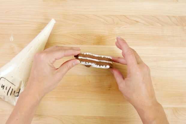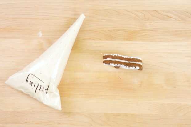 Presione la parte posterior de la segunda galleta en la parte superior del relleno, teniendo cuidado de alinear las galletas arriba y abajo para que de lado se ven como un objeto.