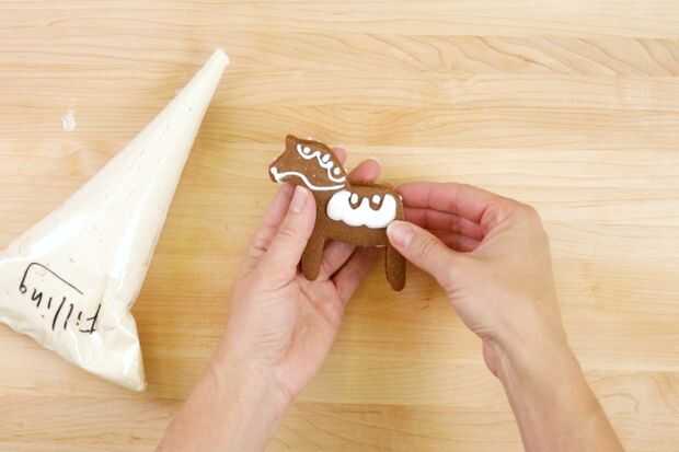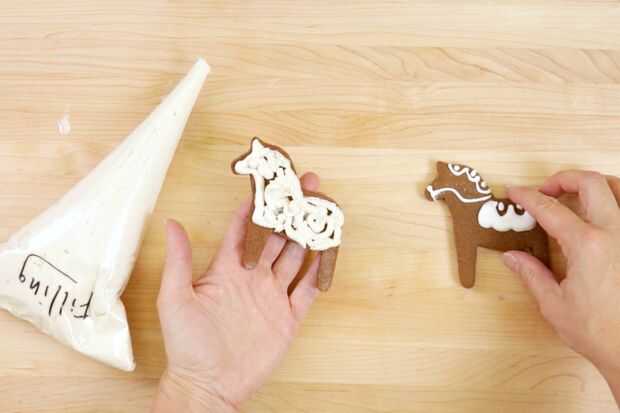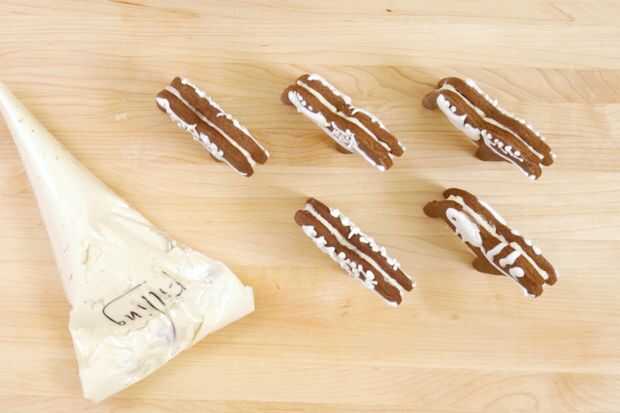 La parte inferior (lado no congelado) de una galleta en un par con el relleno del sándwich de galleta de hielo. Si estás haciendo un animal o algo con las piernas como el mío, sólo poner el relleno en el cuerpo y la cabeza, para que las piernas se ven como las piernas.