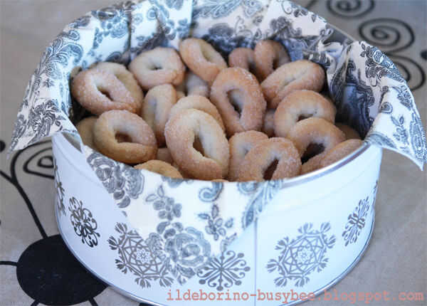 Precalentar el horno a 180 °. Poner todos los ingredientes en un cuenco y mezclar bien, luego trabajar la masa sobre una superficie ligeramente enharinada hasta que confluye y forma una bola suave. Tomar pequeños trozos de masa del tamaño de una nuez y hacerlas rodar para formar una cuerda thinish. Cerca de la cuerda en forma de una rosquilla y dragar un lado de la galleta en el azúcar reservado. Poner las galletas en una bandeja para hornear forrada con papel, con la parte azucarada por encima y hornear durante unos 20 minutos de horno. Estas galletas se mantienen bien durante un par de días o quizás más, no tengo en la casa por eso mucho tiempo...