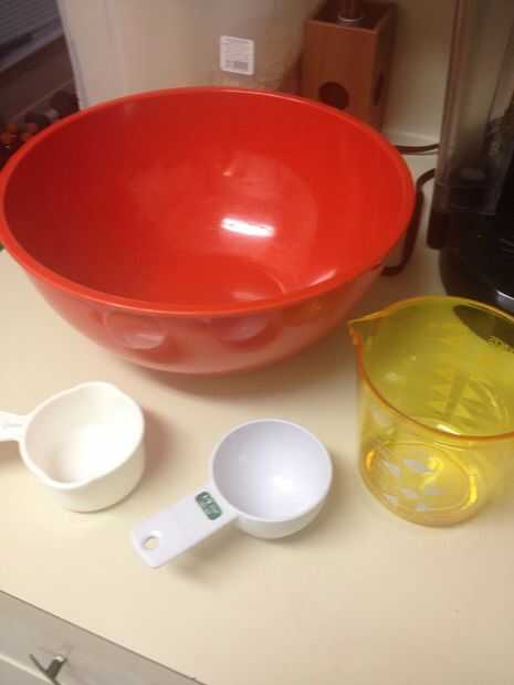 Se reúnen todos los ingredientes y herramientas de medición. Se necesita dos recipientes de mezcla, algunas tazas de medición y una espátula o un mezclador eléctrico.