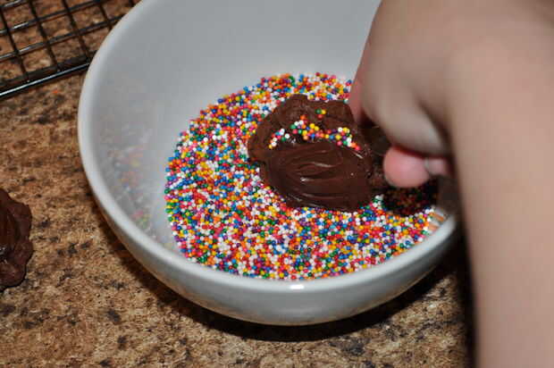 Una vez han helado las cookies, el rodillo los bordes en un recipiente de chispitas.