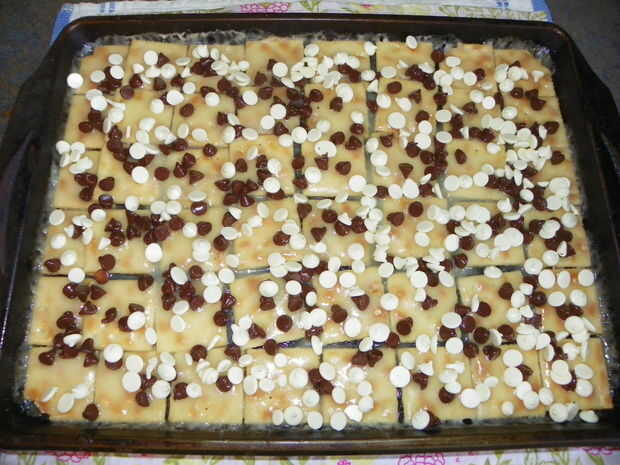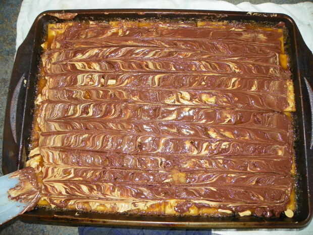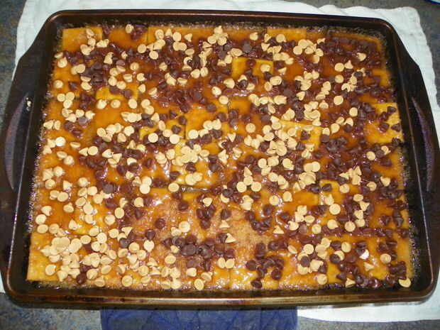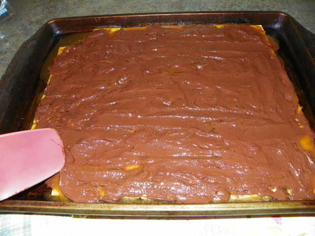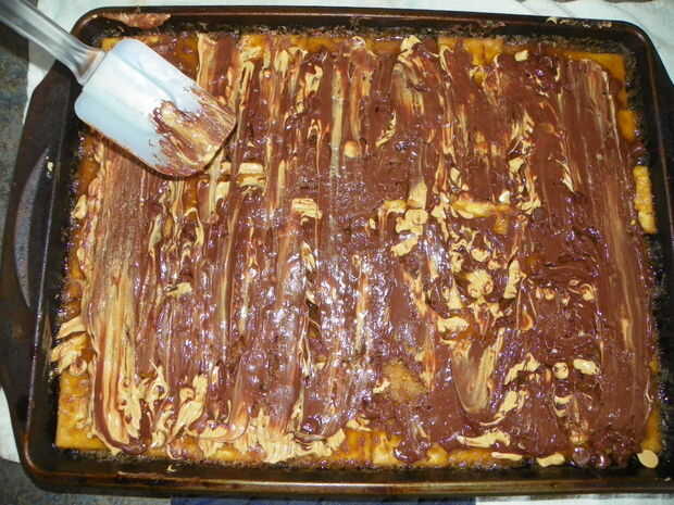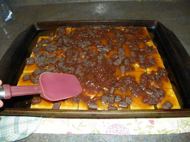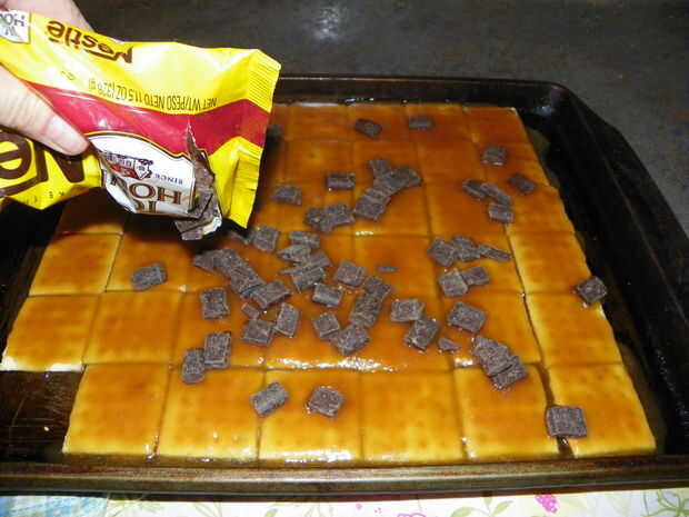 Espolvorea trocitos de chocolate (o chocolate en trozos) sobre mantequilla/azúcar caliente. Se empiezan a derretir inmediatamente. Suave con cuchara.