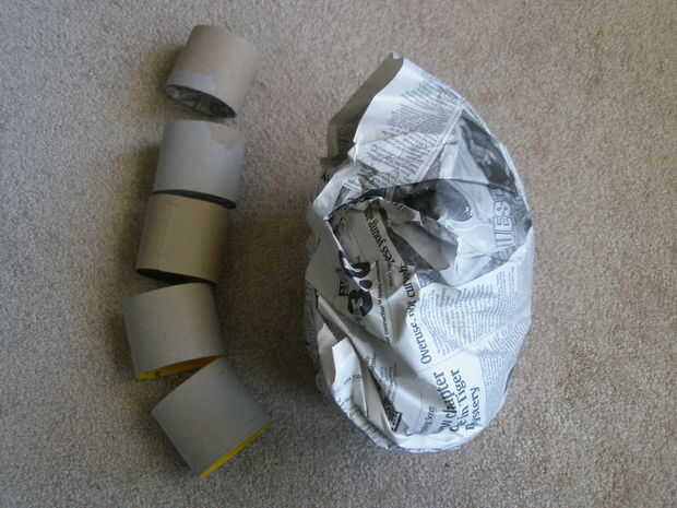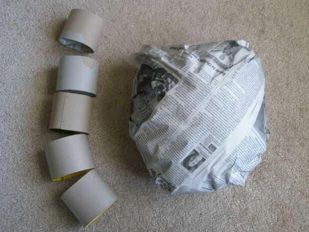 Toma una hoja de periódico y coloque en una bola. Toma otra hoja y coloque alrededor de la bola pequeña que se han formado. Repetir, repetir, repetir. Si la bola pone demasiado grande para el periódico totalmente envolvente, utilice alguna cinta para mantener todo en su lugar. Como que estás haciendo esto, ligeramente squash y aplane la bola que está formando. No quiero una esfera perfecta, aunque si consigues con periódicos arrugados, me gustaría estudiar su técnica.