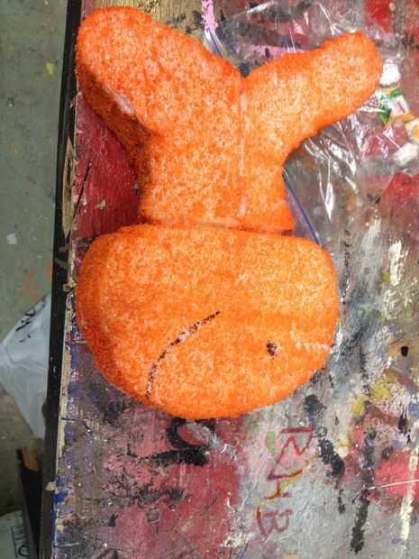 Paso 1: Reunir los materiales We used:Un tablero de la espumaPintura púrpura, marrón, tostada y azulEspuma en aerosolPaso 2: Hacer la galleta Dibujamos nuestro esbozo de galleta en el tablero de la espuma. Utiliza una sierra de calar para cortar las