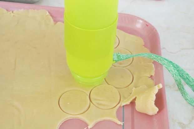 Después de que la masa se hace escalofriante, rodar hacia fuera sobre una superficie enharinada a un grosor de 1/4 de pulgada. A continuación, utilice un cortador de galleta circular que es apenas más pequeño que la boca del tarro de masón para cortar las galletas. Acababa de usar la boca de una botella de agua, pero puede utilizar un vaso o cualquier otro objeto que funciona.