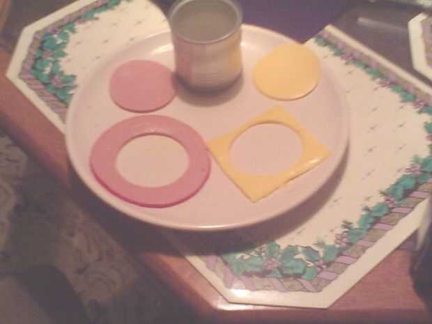 Mientras que es enfriamiento, permite poner a las otras partes. Si usted desea hacer su propio queso, ver Probablemente, utilizará sólo una loncha de queso de la tienda compró para ello establecido. Tomar la rebanada de queso y cortar con el cortador de la galleta. Hacer lo mismo con el fiambre.