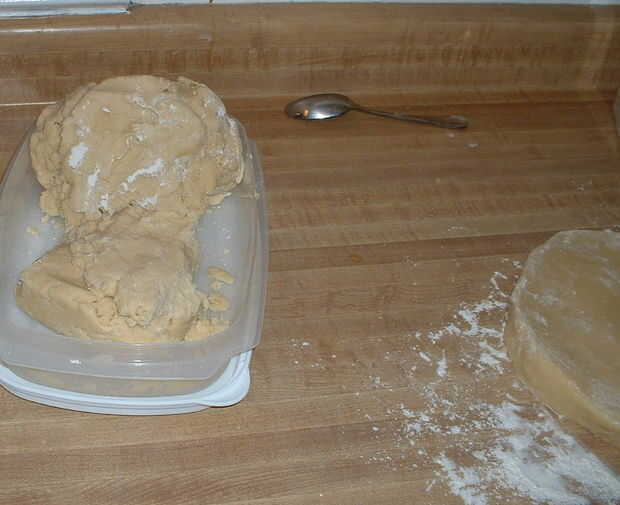 Usando una cuchara de metal trozos de recipiente es el de cavar y trabajarlas en las Palmas un poco hasta que caliente lo suficiente como para sentir como arcilla. Tomar el trozo de arcilla-como y trabajo en forma de crepe. Hacer varias bolas tamaño puñado en panqueques y apilarlos, luego aplastar la pila entera juntos, empujando hacia abajo en él. Este proceso se calienta la masa y haciéndola homogénea, tratando de elaborar burbujas de aire entre los trozos.