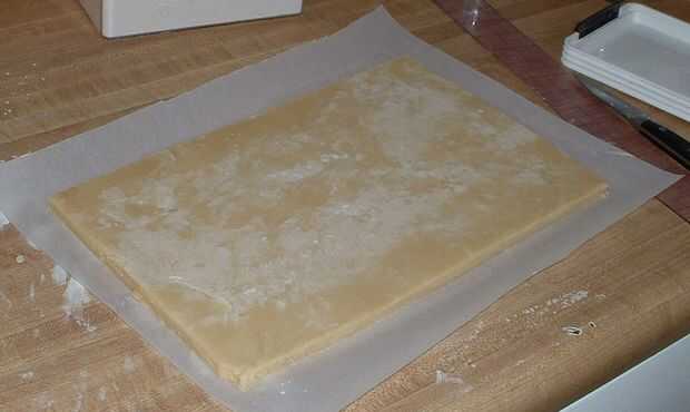 Una vez que el rectángulo aplanado a mano.75 pulgadas de espesor, pasar a hornear el pergamino y obtener su rodillo. Aplaste a una altura de.5 pulgadas con el rodillo, intentar mantener la forma rectangular lo más posible mientras lo hace. Una vez horneada la masa será cortada en baldosas de 2", así que el rectángulo de masa cruda final debe medir un número impar de pulgadas para permitir. 5" de espacio alrededor de los bordes durante el proceso de corte. Medir y cortar la masa sobrante para hacer un número impar de pulgadas por número impar de pulgadas rectángulo y arrojar los restos de la piscina de la masa.