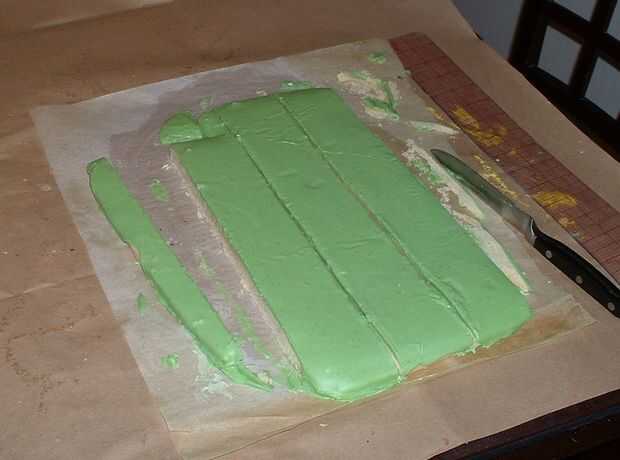 Una vez que el glaseado es totalmente duro es el momento para hacer azulejos de cookie. Tomar cada rectángulo helado galletas y cortar la Plaza de los bordes con un cuchillo bien afilado. Medir una cuadrícula 2", anota la guinda con una navaja o un alfiler para crear a Guía de líneas. Si usted está cortando a través de uno del chocolate rematada rectángulos cookie entonces tenga cuidado de no dejar la rotura del chocolate en trozos desiguales como cortes (corte a través de chocolate frío es duro). Para evitar grietas que calentar un poco antes de intentar cortarlo y utilizar más de un movimiento de sierra para corte a través de la capa superior de chocolate frío. Sin embargo cortando en azúcar glas o la galleta sí mismo uso firmes pasadas hacia abajo para reducir al mínimo las migas y el rasgado.