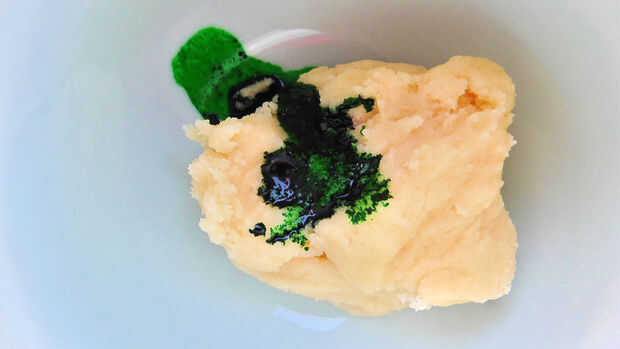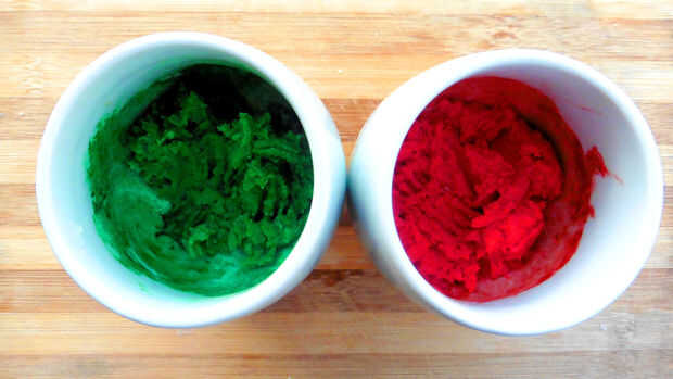 Usted se para colorear el contenido de uno de los tazones de fuente rojo y el otro tazón de fuente verde. He usado unas 7 gotas de colorante para conseguir el color vibrante quería y utiliza un tenedor para mezclar el colorante en la masa.