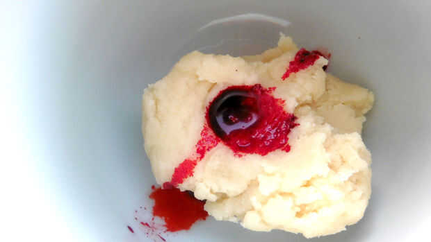 Una vez que tienes tu masa blanco, tome una pequeña cantidad y separar entre dos tazones de fuente - pongo aproximadamente un cuarto de taza de blanco en cada plato.