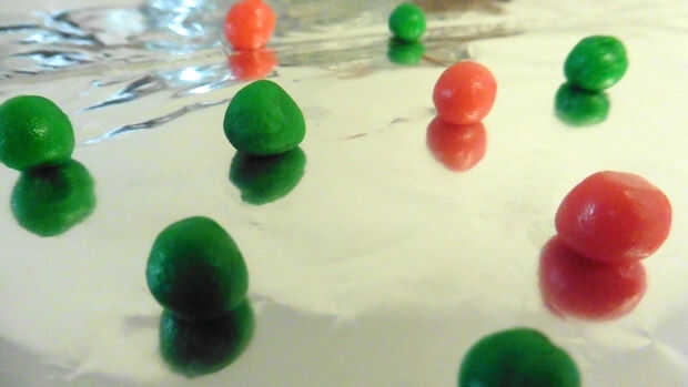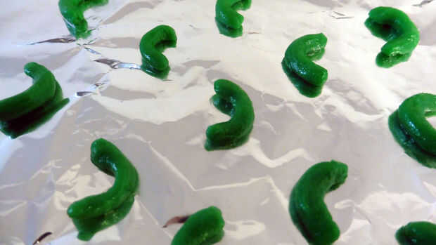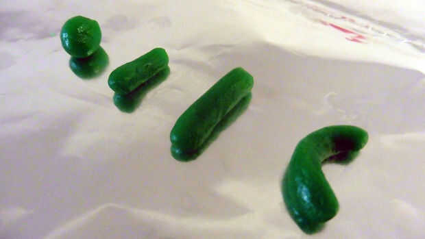 Para los pimientos, empezar con bolas de masa. A continuación, rodar las bolas hacia fuera en troncos. Dejar los troncos en una superficie plana y usar su dedo para empujar el centro de cada registro adelante a creado una forma curva.