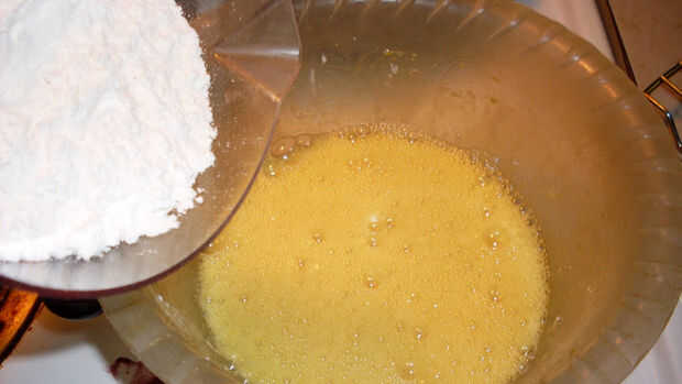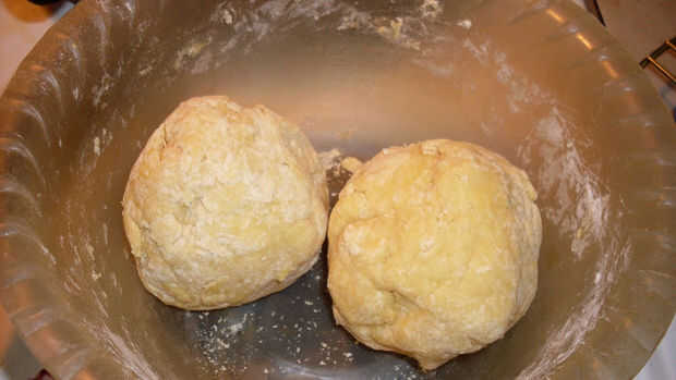 Batir yemas, huevo, crema, Ron, sal y azúcar hasta combinar bien. Añadir harina y empezar a amasar. Dividir la masa en dos bolas, dejar reposar por media hora.