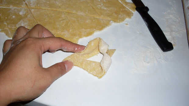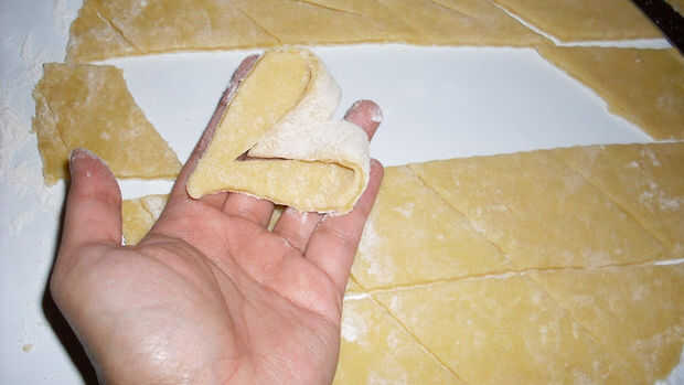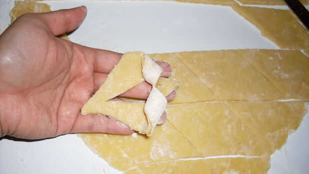 Tire de un extremo y doblar dentro como se muestra en la imagen y algo dobla el otro extremo, otra vez como se muestra en la imagen (esto es solo para hacer las galletas tienen algunas formas, puedes cortar tiras y giro ligeramente y freír, o sea formas prefieres!).